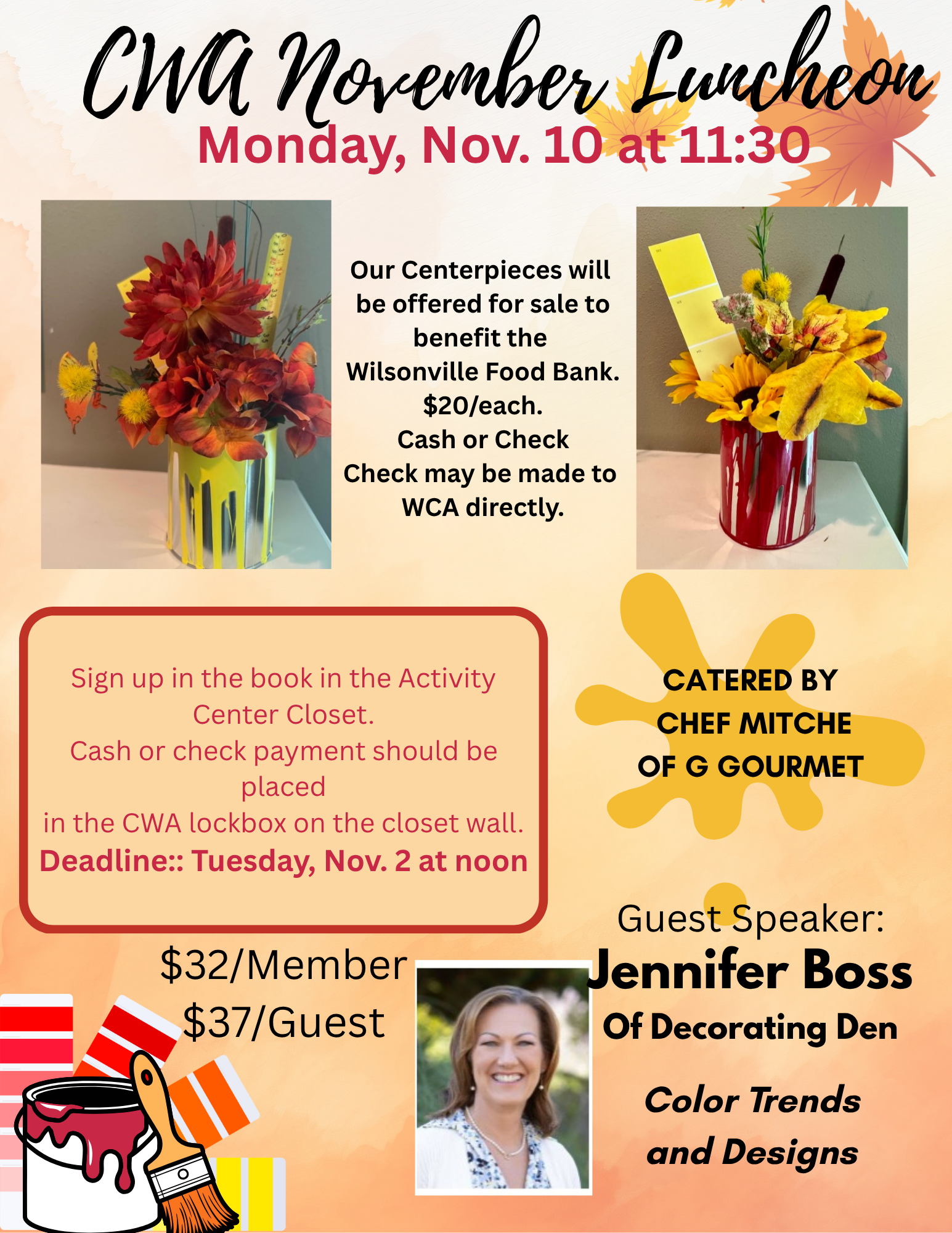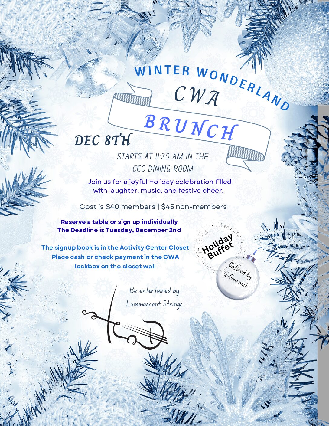 Holidays are approaching and it is a time to enjoy all the season has to offer. The CWA invites you to a Holiday Brunch on Monday, December 8th at 11:30 AM. It should prove to be a festive time and complete with Holiday cheer and entertainment in a Winter Wonderland setting. G-Catering will be