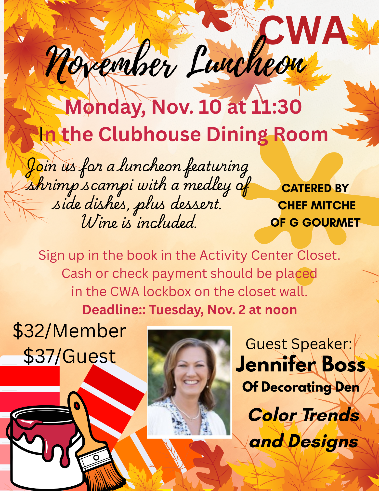 Sign Up book is open for the CWA Novewmber 10 Luncheon. Deadline is Tuesday, November 4.