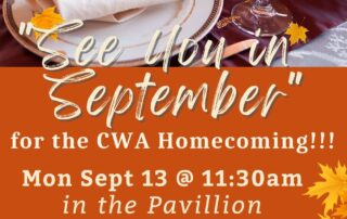 Your CWA board voted yesterday to to go ahead with a modified "Welcome Back" on Monday, September 13th at 11:30 in the Pavillion.